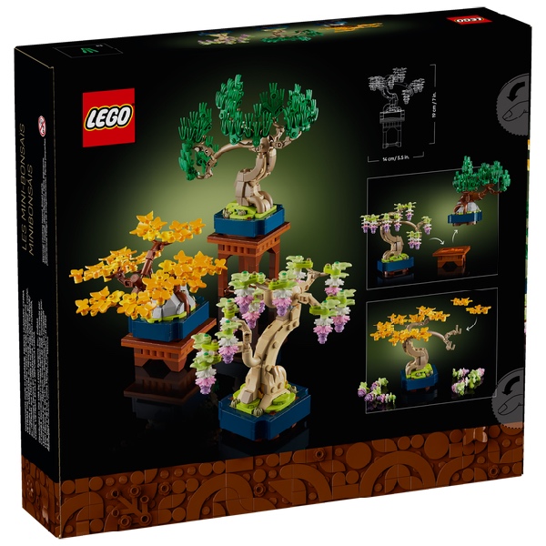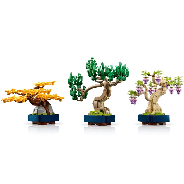 Dompel jezelf onder in de rust van de natuur met deze LEGO Botanicals 10373 Mini Bonsaiboompjes bouwset voor volwassenen, een ontspannend project voor plantenliefhebbers.Ontspan je en kom helemaal tot rust terwijl je 3 elegante bonsaiboompjes bouwt: een Japanse notenboom (ginkgo) met gele bladeren, een Japanse zwarte den met groene naalden en een Japanse blauweregen met lila bloemen. Elk miniboompje heeft verwisselbare bladeren, zodat je je creaties kunt aanpassen. De set bevat ook 2 sierlijke standaards waarmee de bonsaiboompjes op verschillende hoogtes en in verschillende combinaties kunnen worden neergezet voor een prachtig decoratief display