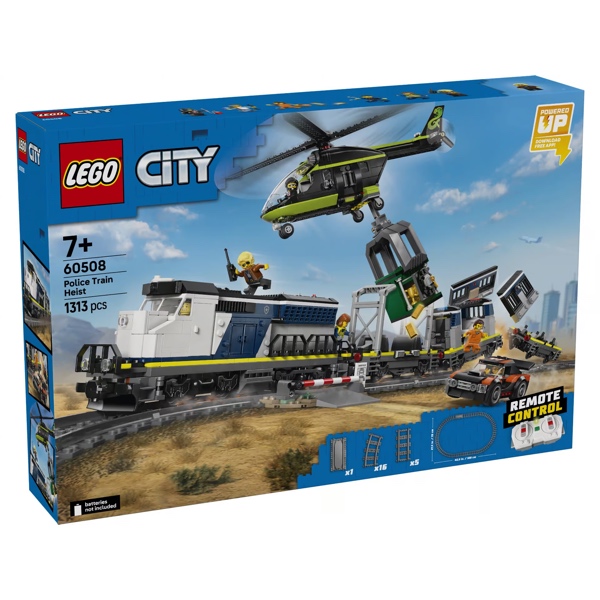 Kom aan boord en beleef non-stop actie met de LEGO City 60508 Overval Op Politietrein speelgoedtreinset voor kinderen vanaf 7 jaar. Deze Powered Up elektrische treinset bevat een werkende locomotief en 3 platte wagons met daarop een gevangeniscel, een bankkluis en een rallyauto. De set bevat ook een ovaal treinspoor met een spoorwegovergang en een stuk rails om treinen terug op het spoor te zetten. Voeg de helikopter met werkende grijpklauw en de minifiguren van een detective, politieagent, treinmachinist en 3 boeven toe voor urenlange fantasierijke verhalen