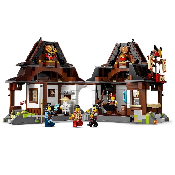 Open het ninjaspeelgoed aan de achterkant om een slaapkamer en een smederij boordevol details en accessoires uit de geschiedenis van de serie te onthullen. Kinderen kunnen de ninjastickers vinden die in de speelset achter een afneembaar helmendisplay zijn verborgen en tegen een uithangbord duwen om de gouden wapenkaart te onthullen.