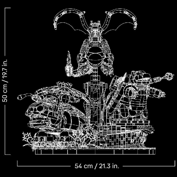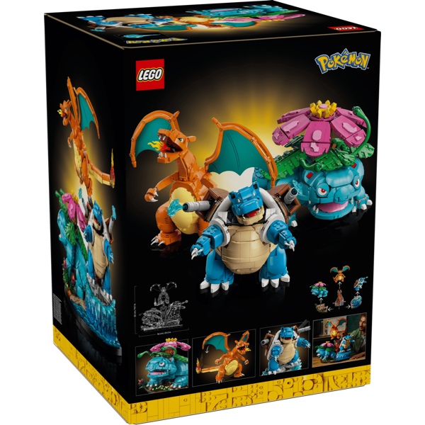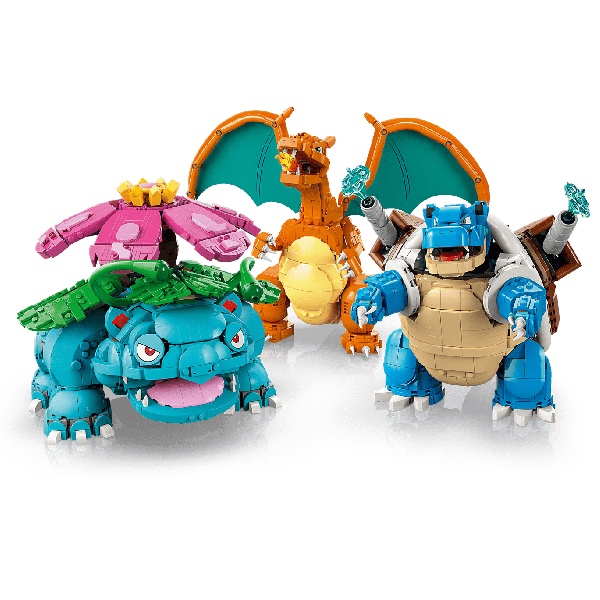 De set is geïnspireerd op de wereld van Pokémon en bevat maar liefst 6838 onderdelen. Je bouwt drie iconische actiefiguren die elk hun eigen kracht uitstralen. Venusaur vertegenwoordigt de Gras-soort en beschikt over beweegbare takken en poten. Blastoise staat symbool voor Water en heeft een verstelbare kop, armen en waterkanonnen. Charizardbelichaamt Vuur en heeft beweegbare vleugels, poten, armen en kop.