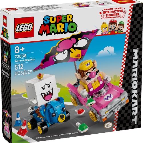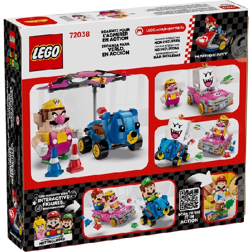 Race, drift en zweef met deze LEGO® Super Mario™: Mario Kart™ – Wario en King Boo speelset voor kinderen (72038). De set is een leuk cadeau met Nintendo® personages voor gamers vanaf 8 jaar en bevat 2 LEGO Super Mario figuren en modellen van de bekende Blingbolide en Knuffelquad voertuigen, plus 2 pylonnen. Elke kart heeft een lanceringsfunctie voor schilden en kan driften. De Blingbolide heeft een afneembare vlieger die ook op de Knuffelquad past