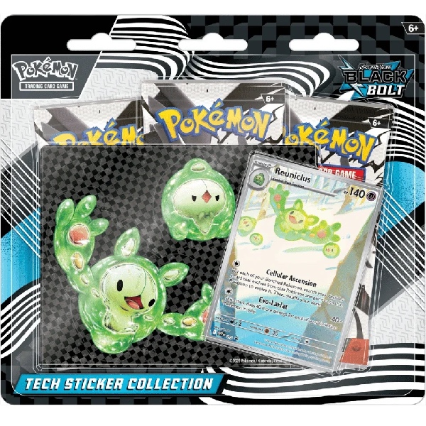 Versier je laptop, tablet of telefoon met duurzame techstickers van de volledige evolutieketen: Solosis, Duosion en Reuniclus! Ontdek vervolgens nog meer Pokémon die oorspronkelijk in de Unova-regio zijn ontdekt wanneer je drie booster packs opent uit de speciale Scarlet & Violet – Black Bolt-uitbreiding!