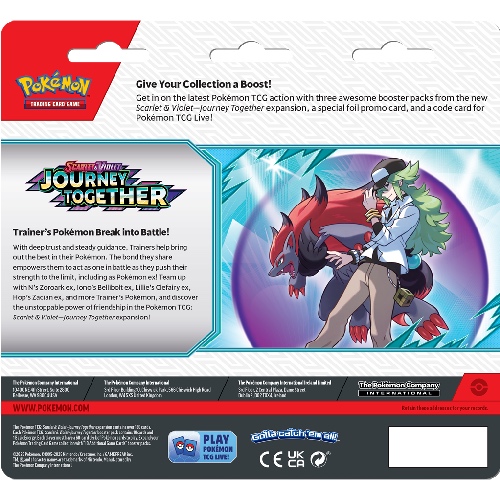 De band die ze delen, stelt hen in staat als één te handelen in gevechten terwijl ze hun krachten tot het uiterste drijven, inclusief als Pokémon ex! Werk samen met N’s Zoroark ex, Iono’s Bellibolt ex, Lillie’s Clefairy ex, Hop’s Zacian ex, en meer Pokémon van Trainers, en ontdek de onstuitbare kracht van vriendschap in de Pokémon TCG: Scarlet & Violet—Journey Together uitbreiding!